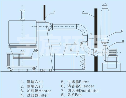 空气经加热净化后,由引风机从下部导入,穿过料斗的孔洞板。在工作室内,经搅拌和负压作用形成流态化,水份快速蒸发后随着排气带走,物料快速干燥。