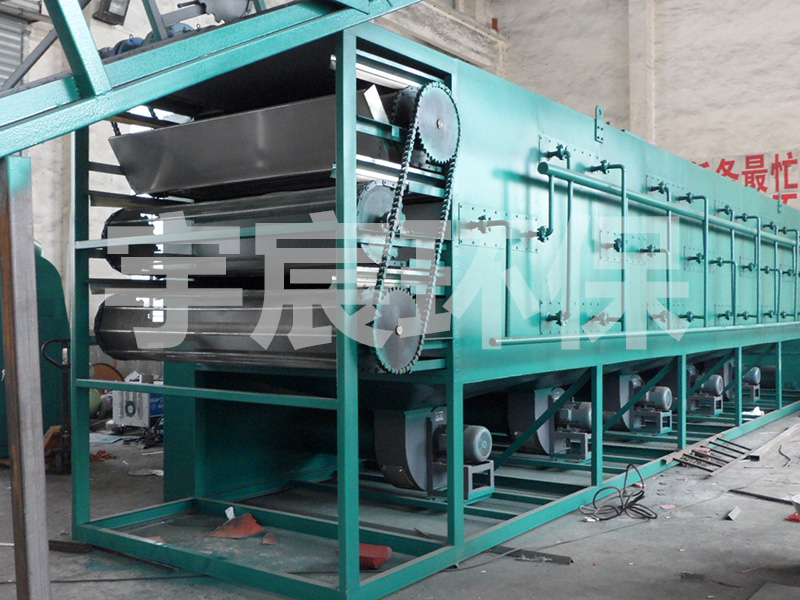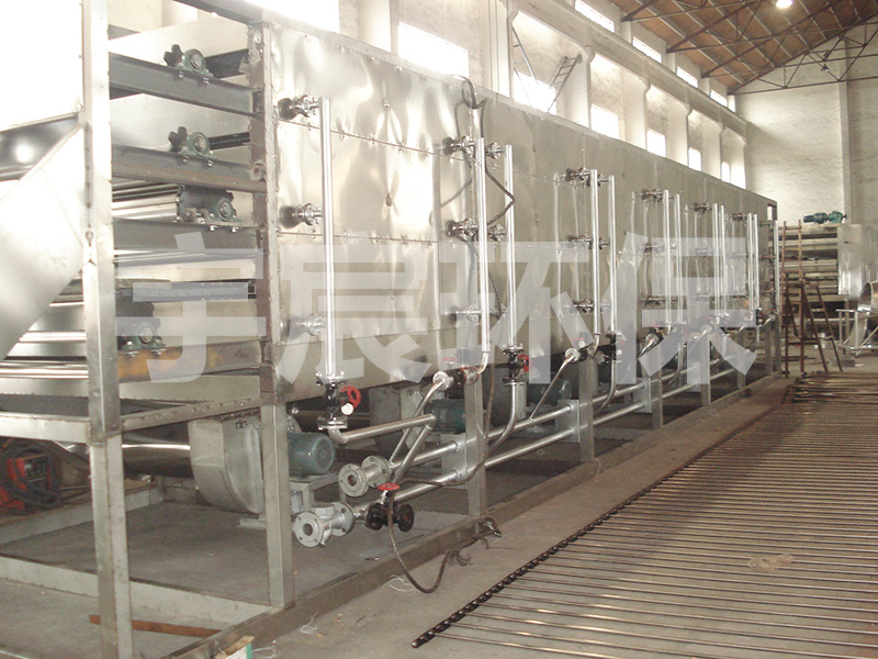 DW系列多层带式干燥机是成批生产用的连续式干燥设备,用于透气性较好的片状、条状、颗粒状物料的干燥,对于脱水蔬菜、催化剂、中药饮片等类含水率高、而温度不允许高的物料尤为合适;该系列干燥机具有干燥速度快、蒸发强度高、产品质量好的优点,对脱水滤饼状的膏状物料,需经造粒或制成条状后方可干燥。