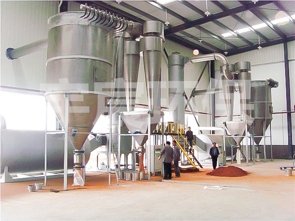 热空气切线进入干燥器底部,在搅拌器带动下形成强有力的旋转风场。膏状物料由螺旋加料器进入干燥器内,在高速旋转搅拌桨的强烈作用下,物料受撞击、磨擦及剪切力的作用下得到分散,块状物料迅速粉碎,与热空气充分接触、受热、干燥。脱水后的干物料随热气流上升,分级环将大颗粒截留,小颗粒从环中心排出干燥器外,由旋风分离器和除尘器回收,未干透或大块物料受离心力作用甩向器壁,重新落到底部被粉碎干燥。